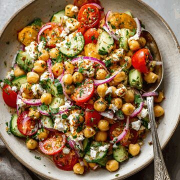 You set your salad in a big shallow bowl or on a flat platter so each bit looks inviting. You line the chickpea salad in the middle and add colorful rings of sliced cucumber and cherry tomatoes around it. You sprinkle on crumbled feta or cubed avocado for extra creaminess. You remember that arranging something pretty makes you wanna dive right in. You can also tuck in wedges of pita bread or toasted flatbread around the edges so you can scoop and bite at the same time.