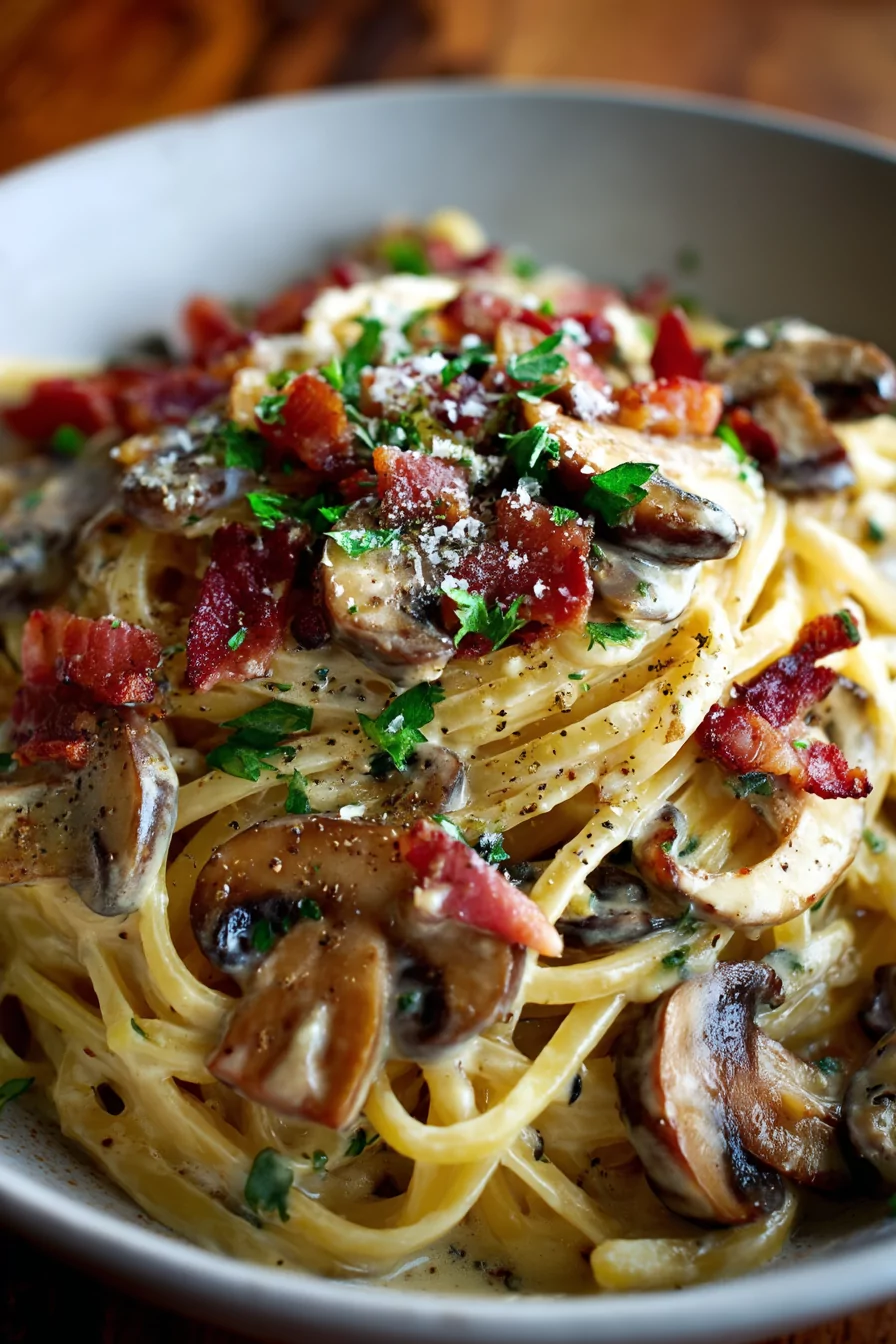 Flavor-wise, this dish is a mix of savory, hearty, and luscious notes all playing together. The bacon gives you a crunchy, umami burst, while the mushrooms offer an earthy anchor. Together with the creamy sauce, you end up with a pasta meal that feels both fancy and comforting, making every bite really satisfying.