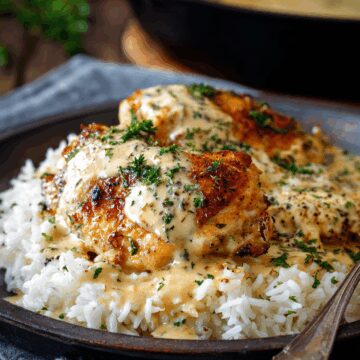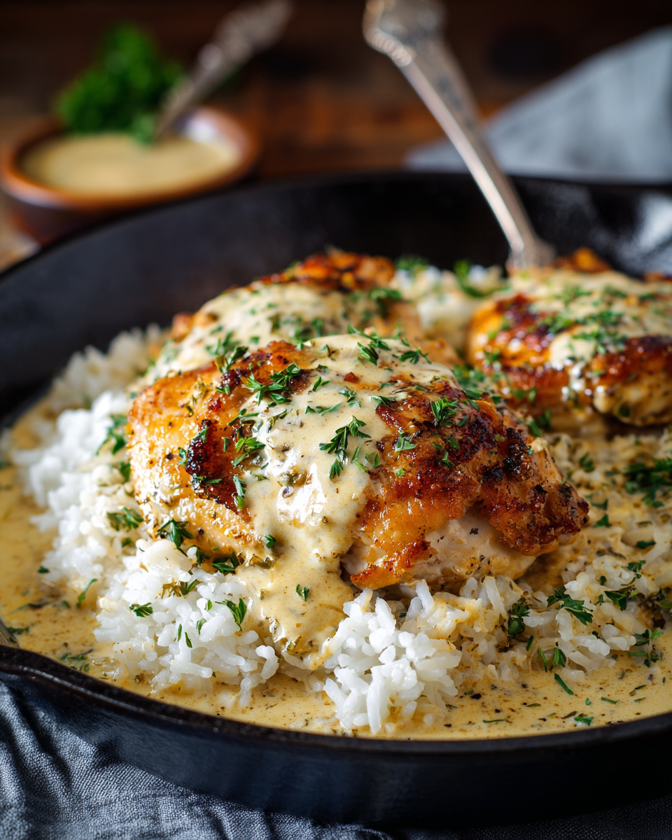 - Serve the creamy smothered chicken over the cooked rice, garnished with parsley if desired.