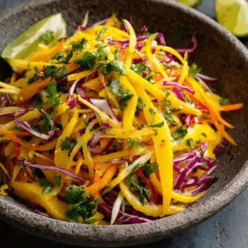 - In a large mixing bowl, combine the diced mangoes, shredded cabbage, grated carrot, sliced red bell pepper, sliced red onion, and chopped cilantro. Toss well to mix all the vegetables and fruit evenly.