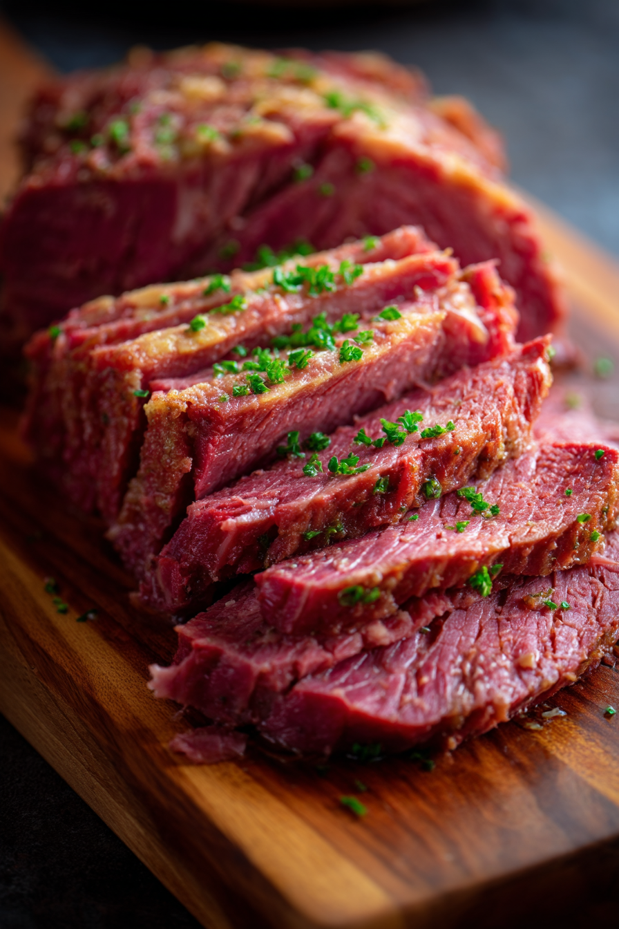 After it's done, take the corned beef out and let it rest for about 10 to 15 minutes. This resting time helps the juices move back into the meat so it stays moist when you cut it.