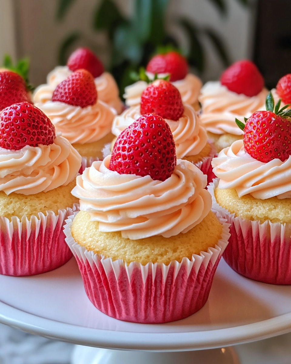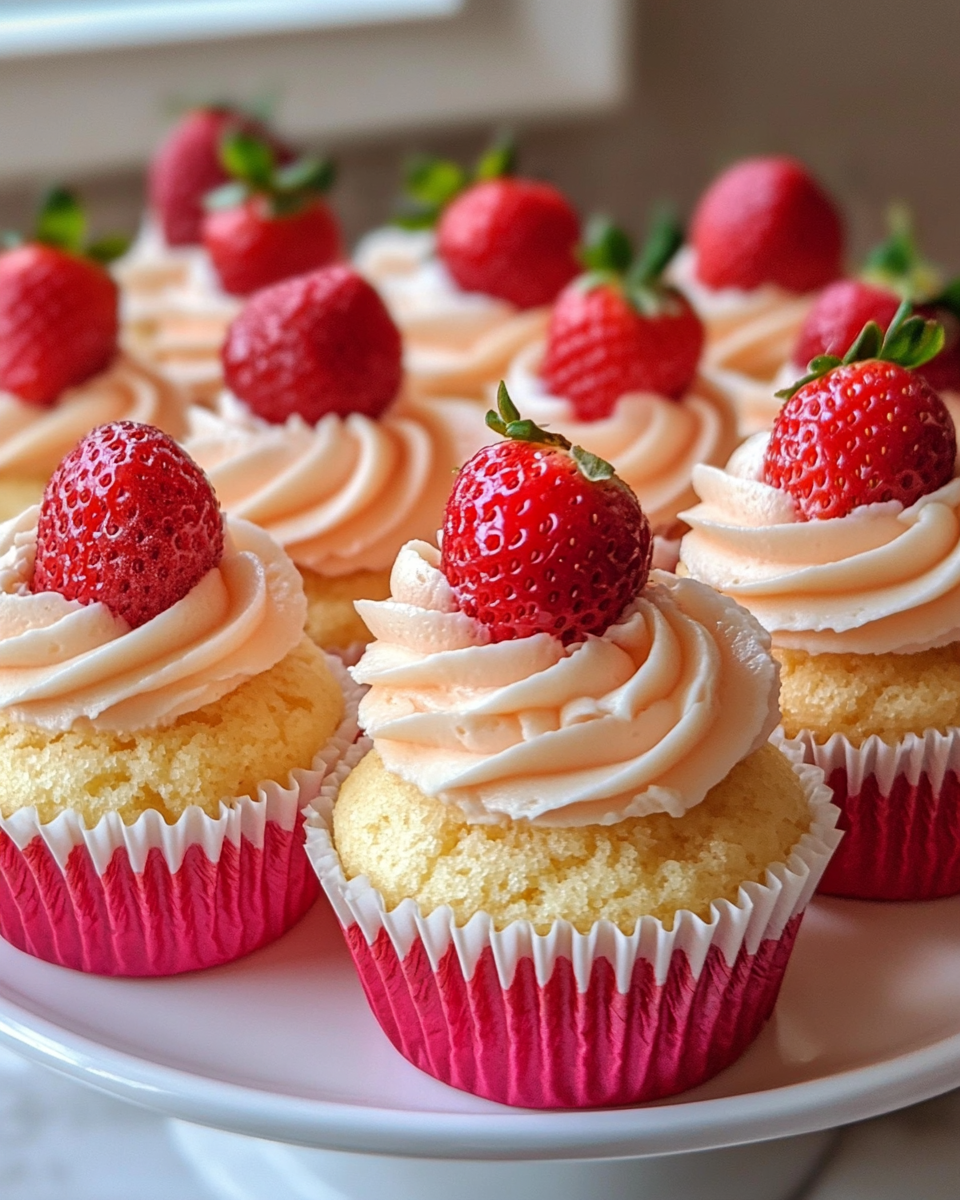 - For the buttercream, beat softened butter until creamy, gradually add powdered sugar, vanilla, strawberry puree, salt, and heavy cream until smooth and fluffy. Frost cupcakes as desired.