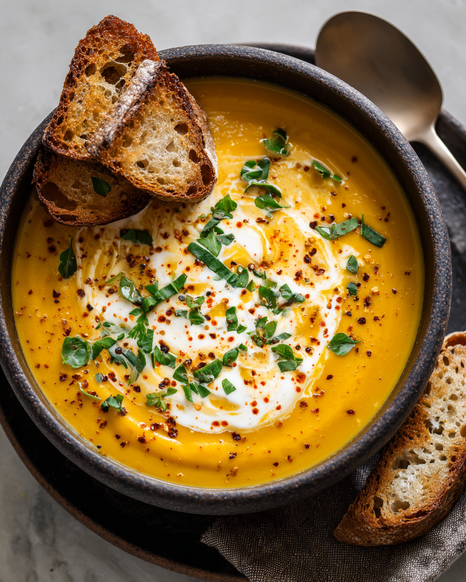 Pour back that reserved chunky bit and stir. It adds a tiny textural surprise. Top with a swirl of coconut cream or a drizzle of olive oil and scatter chopped cilantro or parsley. That fresh green pop brightens the warm tones and adds a final scent kiss.