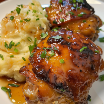 This is a delightful dish featuring juicy, tender chicken thighs with a sweet smoky glaze paired with creamy, rich mashed potatoes infused with smoked Gouda cheese.